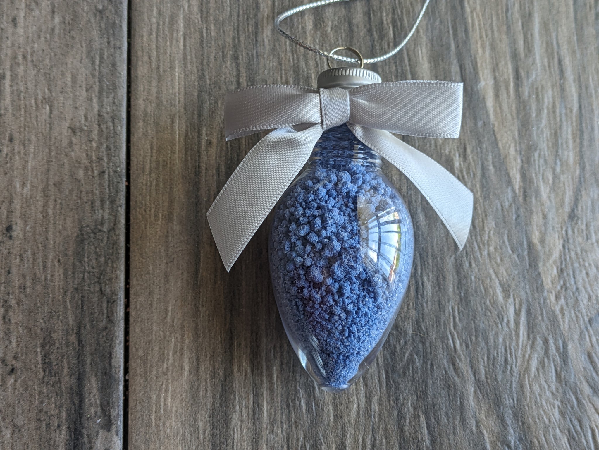 Blue w/ a silver bow, scented in peppermint and vanilla.
