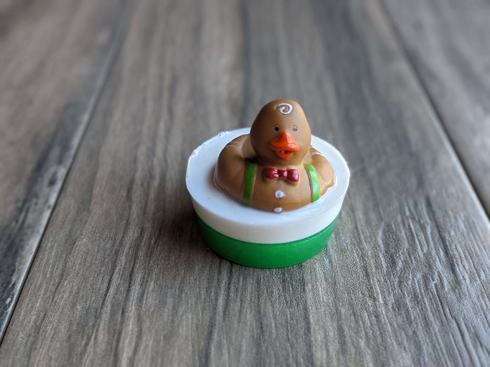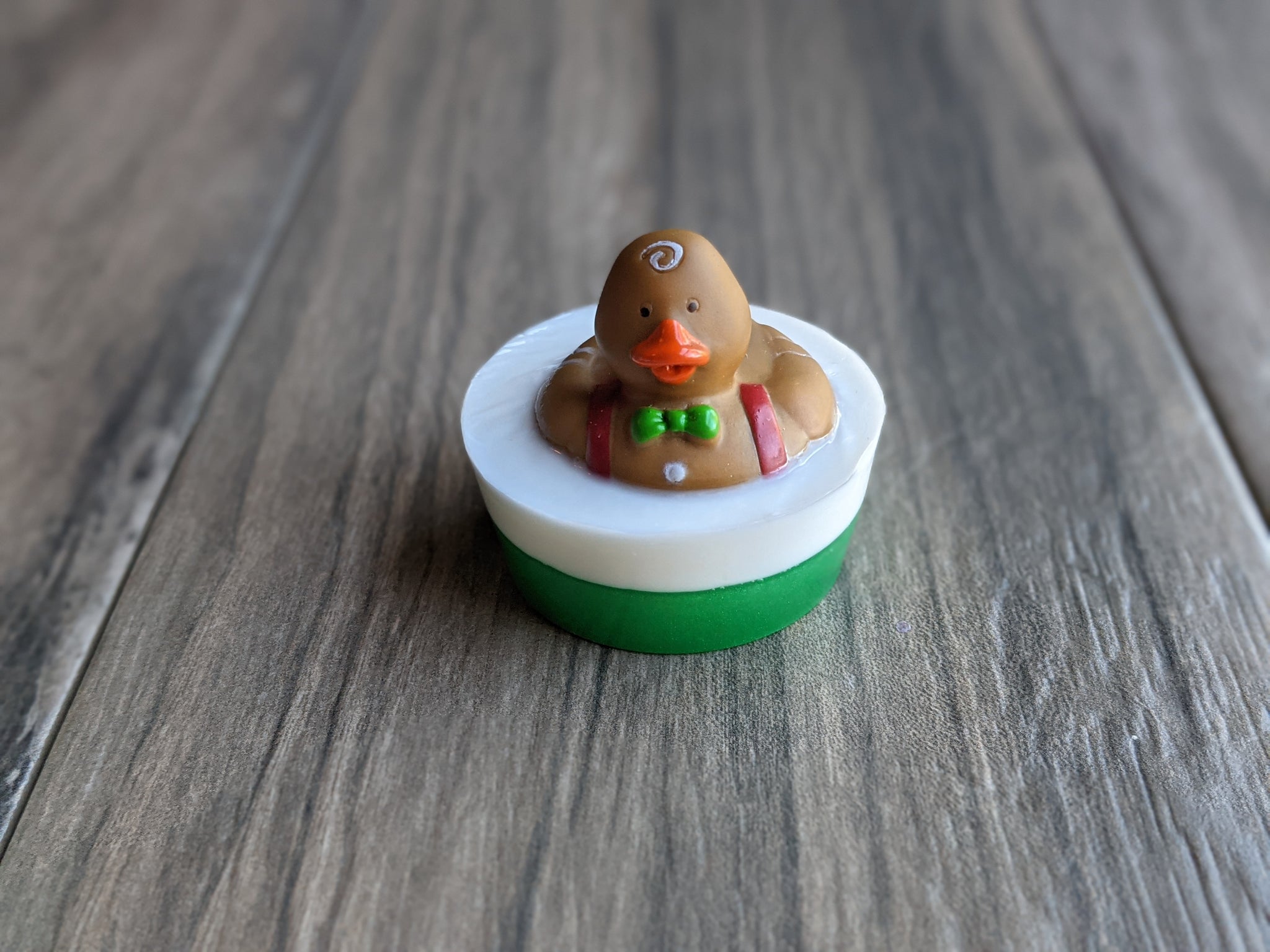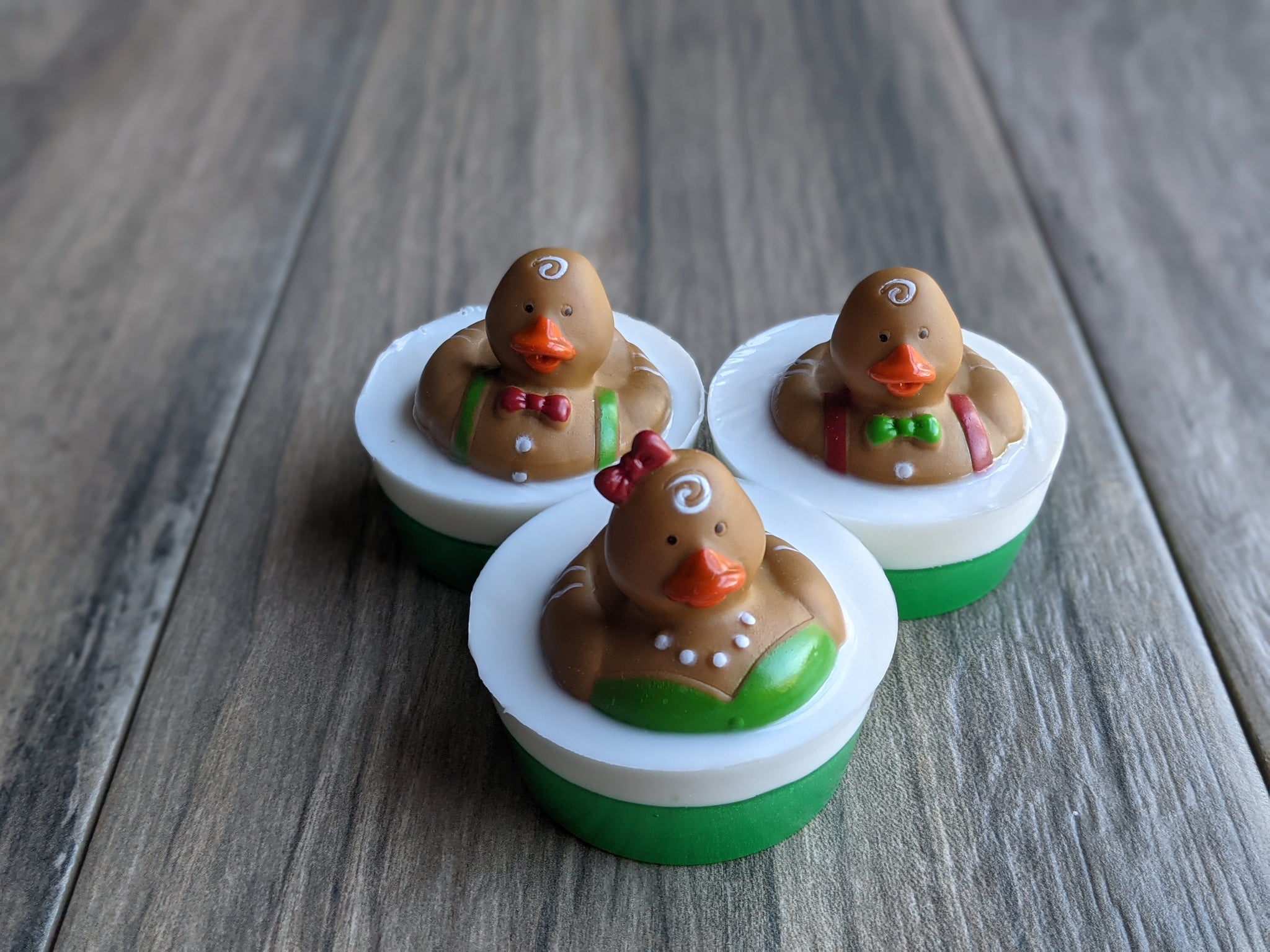 A Christmas addition to our duck soap family - Gingerbread ducks!  There are 3 versions; a girl with a necklace ;-), a boy with a green bow tie, a boy with a red bow tie.